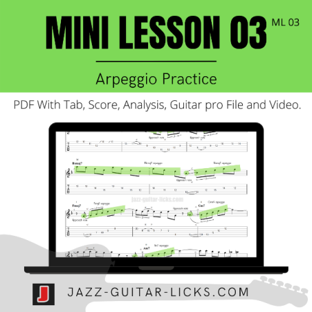 This package for guitarists contains a PDF with tab, video, backing track and guitar pro file for practicing arpeggios over a basic jazz blues progression. -