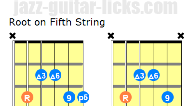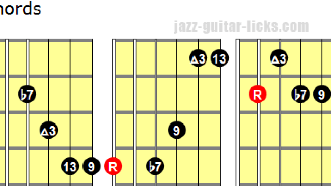 Major thirteenth guitar chords (maj13). Lesson with charts, diagrams and shapes to play extended major seventh chords on the guitar. -
