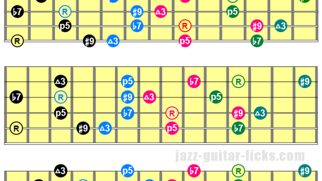 How to play dominant seventh sharp ninth chords, 7#9, on the guitar. Check out this jazz guitar lesson with neck diagrams and voicing charts for a better understanding of this altered dominant chord. -