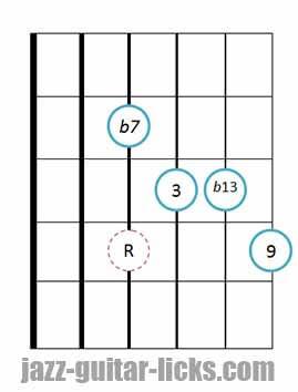 Dominant 9b13 - Guitar Chord Diagrams - Drop 2 & Drop 3 Voicings