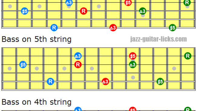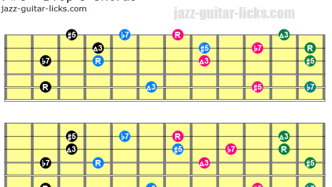 This lesson show you how to play augmented major 7 chords on guitar. Diagrams and drop 2, drop 3 voicing charts. -