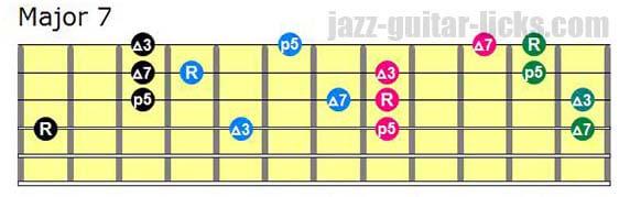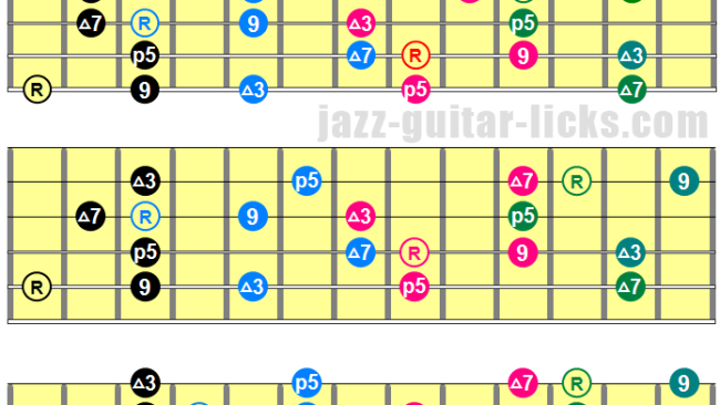 Major Seventh Chords (Maj7) - Drop 2, Drop 3 and Drop 2 & 4 Voicings with Guitar Diagrams