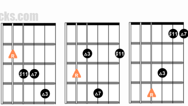 Major Seventh Sharp Eleventh Chords (maj7#11) - Guitar Diagrams and Voicing