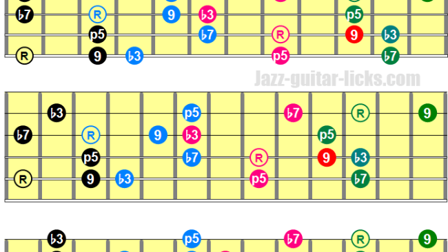 A minor 9th chord can be seen as a minor seventh chord with a ninth added. This jazz lesson is about basic positions and drop 2 voicings with diagrams, shapes and formula charts to play them on the guitar. -