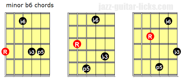 This lesson explains the main differences between minor flat sixth (mb6), minor flat thirteenth (mb13) and minor 7 add b13 chords. Diagrams and formula charts to play them on guitar. -