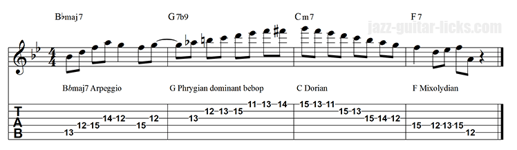 This first example show how to play the Phrygian dominant bebop scale over the VI7b9 chord a rhythm changes turnaround.