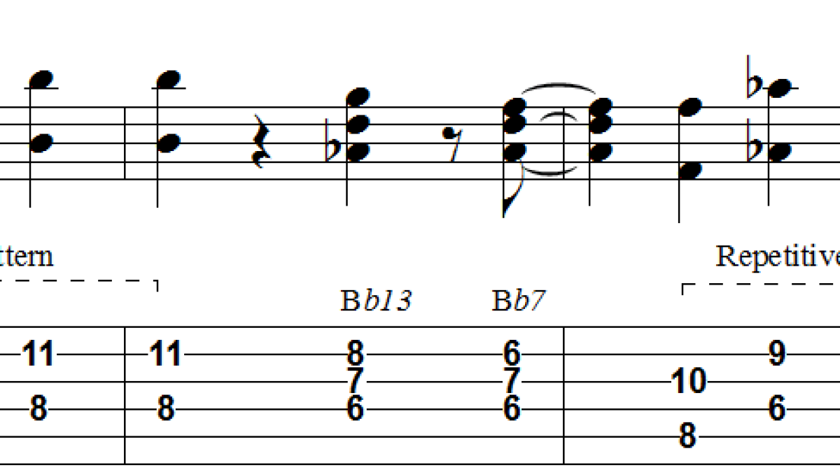 This short guitar lick with TABS show you how Emily Remler used the octave playing technique over a Bb7 chord while playing rootless dominant voicings.